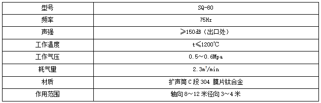 由于需依托聲響能量使反響器內(nèi)塵土顆粒發(fā)生振動(dòng)而清灰,有必要選用特定頻率的某些聲強(qiáng),較低的頻率意味著有更大的清潔區(qū)域,具有更低頻率的聲波清灰設(shè)備可提供更大的有用清灰規(guī)劃。具體參數(shù)如下: